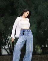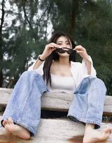 这组写真的穿搭,堪称一套经典的“治愈系”穿搭范本。整体造型以蓝、白为主色调,这与大海、沙滩、天空的自然色彩完美呼应,营造出纯净清爽的视觉感受。核心单品是那件简约的白色吊带背心,它最大限度地展现了锁骨的线条与肩颈的肌肤,是夏日赋予身体呼吸感的绝佳选择。而外搭的白色衬衫则扮演了至关重要的角色:它既是防晒的实用单品,也为造型增添了随性的层次与飘逸的动感;当梁洁起舞时,飞扬的衣角便成了捕捉风与自由的最佳注脚。下身搭配的宽松蓝色牛仔裤,则注入了一抹休闲与率性的基调,使整体造型在柔美之余不失筋骨,完美契合了海边漫步与起舞所需的舒适与自由。这种“外松内紧”的叠穿哲学,正是当下推崇的“慵懒随意的松弛感”的最佳体现,让人感到美好却毫无压力。