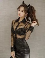 透明上衣的流行源于对自由与个性的追求。它不再是单纯的性感象征,而是成为女性表达自我态度的媒介。在这组写真中,透明上衣采用了轻薄的纱质面料,上面可能点缀着细微的刺绣或亮片,在光线照射下散发出柔和的光泽。这种设计不仅增添了服装的层次感,还与模特的微卷发相呼应,营造出梦幻般的氛围。微卷发是这组写真的另一大亮点,它不像大波浪那般张扬,也不似直发那般拘谨,而是以自然的弧度包裹着脸颊,衬托出模特精致的五官。卷发的蓬松感与透明上衣的飘逸感相结合,让整体造型显得轻盈而灵动。