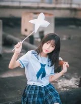 在情感表达上,这组写真传递了青春期的微妙情绪。少女手持风车的动作,既有孩童般的天真,又带着少女的羞涩与自信。她的眼神时而望向远方,仿佛在思考人生的无限可能;时而低头凝视风车,流露出对当下瞬间的珍惜。天台作为场景,不仅提供了视觉高度,还象征着她的内心世界——一个可以逃离日常、放飞梦想的空间。风车的转动象征着时间的流动,而她的静止姿态则暗示着对美好的捕捉,这种动与静的平衡让照片充满了哲学意味。观者或许会联想到自己的青春记忆,那些在风中奔跑、无忧无虑的日子。