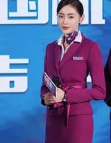 2019年9月,电影《中国机长》首映礼红毯上,主演张天爱以一袭标准的航空公司空姐制服惊艳亮相,瞬间成为全场焦点。这件量身定制的制服完美复刻了航空职业装的精髓,深蓝色的外套剪裁利落,肩部线条挺拔,胸前刺绣的航徽在灯光下泛着细腻的光泽。她将长发挽成端庄的空姐发髻,几缕碎发温柔地垂在耳侧,配上经典的红色丝巾结,既展现了职业女性的干练,又透露出东方女性的柔美气质。