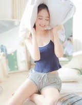 画面的主角身着简约的蓝色细肩带背心与白色高腰短裤,这身搭配堪称夏日清凉与活力的范本。蓝色背心采用紧身设计,勾勒出优美的上身线条,U型领口不经意间流露一丝清爽的性感。而下身的白色高腰短裤则极大地优化了身体比例,裤长恰到好处地停留在大腿中部,不仅拉伸了腿部视觉长度,更凸显了双腿的笔直与纤细。整体白蓝配色清爽干净,与居家环境浑然一体,给人一种毫无拘束的舒适感。