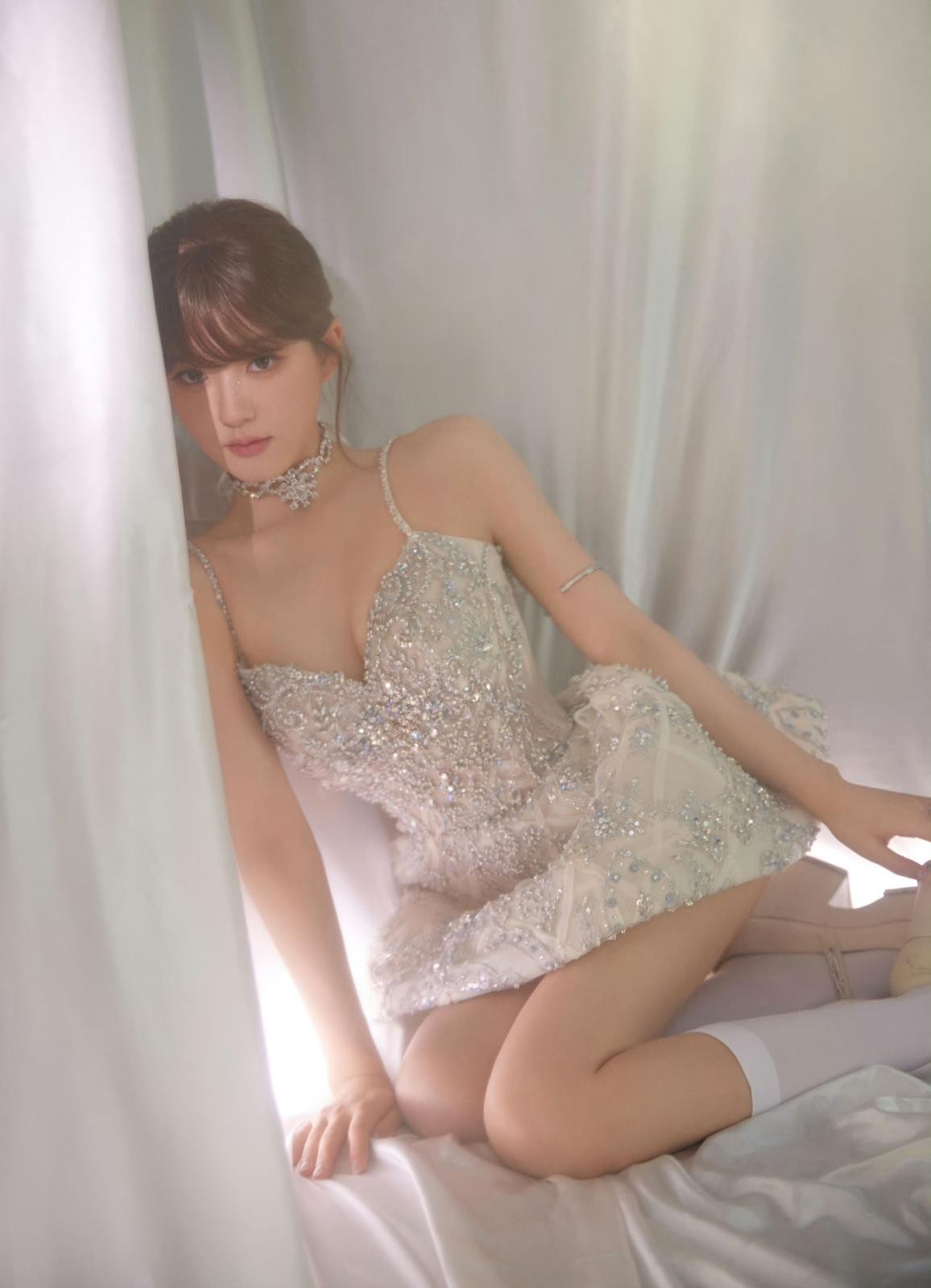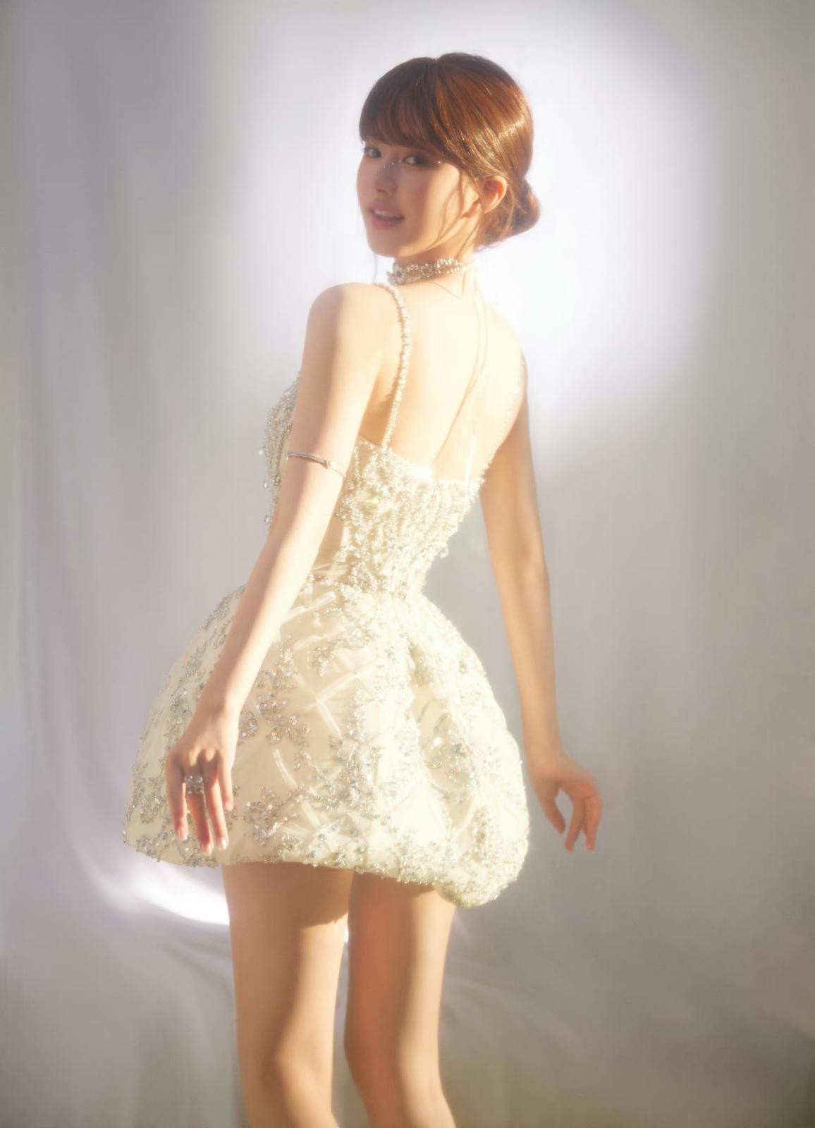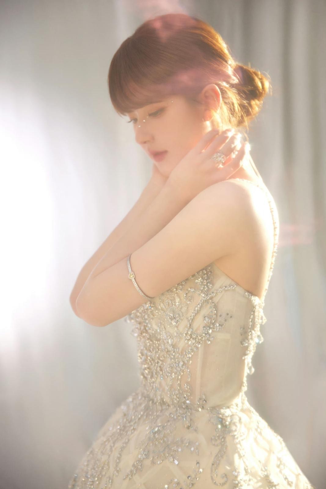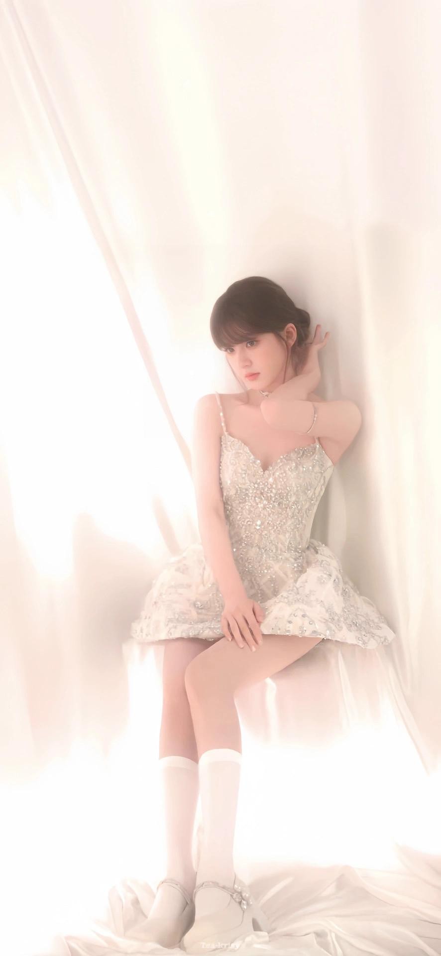 这组写真的成功,首先归功于服装与赵露思个人气质的完美契合。这条白色吊带裙设计极尽精巧,轻纱与蕾丝材质层层叠叠,充满了浪漫的公主风。裙身修身的剪裁恰到好处地勾勒出她纤细却不失柔美的腰身曲线,而吊带设计则自信地展露出她迷人的直角肩与修长的天鹅颈。赵露思甜柔的身材线条与裙装少女感的娇憨设计相得益彰,共同放大了那份特有的亲和力与观众缘。