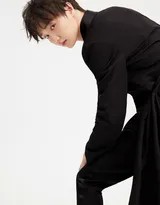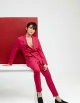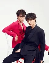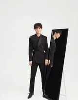 写真中,最引人注目的莫过于刘亦城与孙胤嘉通过“红与黑”的经典配色所展现出的迥异气质。刘亦城选择了一身剪裁得体的红色西装。他眉宇间蕴藏的沉稳与自信,巧妙地将西装的优雅面料质感与个人内在的刚毅气质融为一体。红色在他身上并非张扬,反而成为一种内敛的力量,在镜头前随着他的举手投足,释放出充满故事感的想象空间。